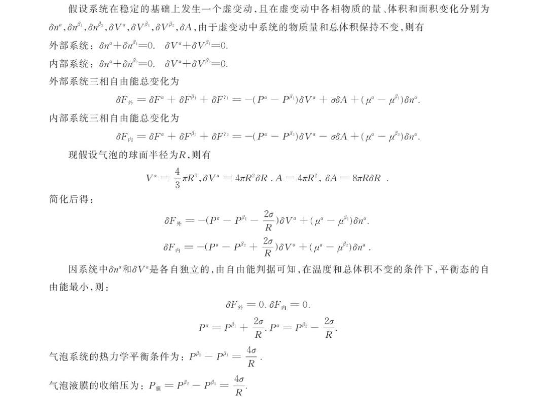 设气泡稳定时液膜为α相,泡外蒸汽为β相,泡内蒸汽为β2相,泡外表面为相,泡内表面为2相.若将气泡表面理想化为标准球面,则表面相的物质量n"=n=0.当气泡稳定后系统满足热平衡条