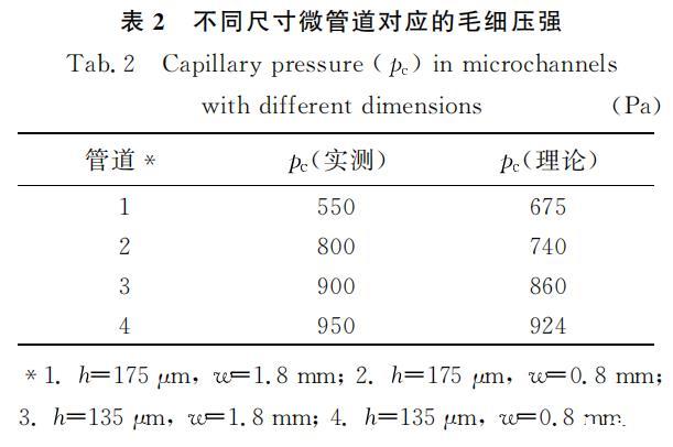 当水流过干燥管道时,表面张力产生的毛细压强阻碍水的流动,此时的速度-压强关系如图8所示。在图8的每条曲线上都有一个转折点,且在转折点之后水的流速迅速增加,转折处的压强被作为毛细压强p。对于这种现象可解释为在压强小于毛细压强的时候,水只能在重力作用下极缓慢流动,由于速度极慢,沿程水头损失可忽略不计;当压强大于毛细压强时,黏性力和压强差平衡,这时的流速增加较快。毛细压强Pc的实测值和理论值如表2所示。水对于PDMS和压敏胶的前进角都是120°,对于Teflon涂膜的栅网接触角是150°(芬兰Kibron公司生产的Delta-8全自动高通量蜜桃AV免费观看)。实验结果与理论计算一致。
