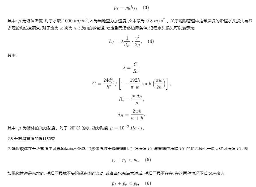 其中:rho为液体密度,对于水取1000~kg/m^3,g为当地重力加速度,文中取为9.8~m/s^2。关于矩形管道中定常层流的沿程水头损失有很多理论和仿真研究,对于宽为w,高为h,长为l的微管道,考虑到无滑移边界条件,沿程水头损失可以表示为: