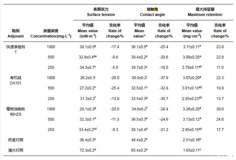 表1添加3种助剂后22.4%螺虫乙酯悬浮剂药液表面张力、叶面接触角和最大持留量的变化