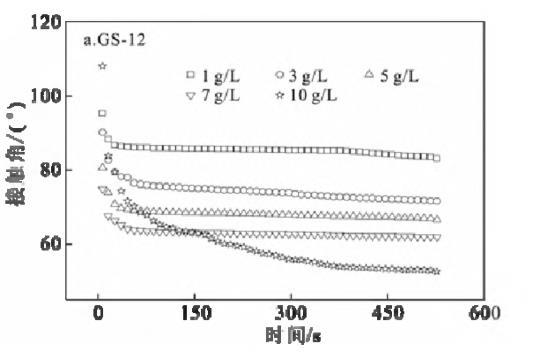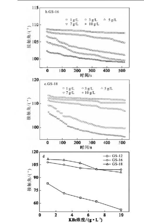 在KBr浓度区间1~10 g/L内,GS-12随着KBr浓度的增加,接触角显著减小,而GS-16和GS-18则变化不明显。可以解释为:对于GS-12而言,KBr浓度越高,固/液界面处的填料越紧密,导致气/液固界面张力值降低,而疏水链较长的GS-16和GS-18其自身降低界面张力的能力有限,所以,随KBr浓度增加,接触角变化有限[1,19]。此外,随着KBr浓度的增加,液滴在石蜡膜上的接触角值减小。