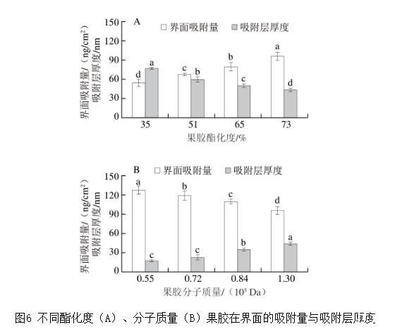 图6不同酯化度(A)、分子质量(B)果胶在界面的吸附量与吸附层厚度