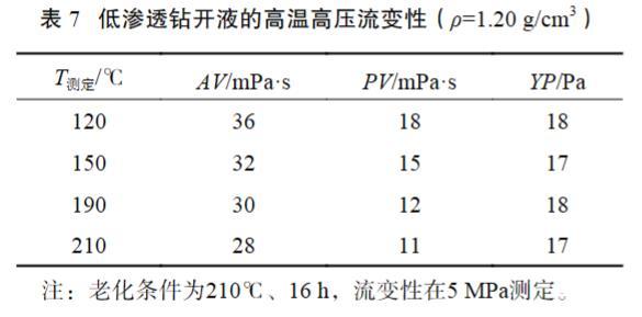 表7低渗透钻开液的高温高压流变性(ρ=1.20 g/cm3)