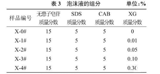 表3为泡沫溶液的配方。根据三元复配体系的发泡性能,选取发泡性能最佳的9号组,无患子皂苷、SDS、CAB质量分数固定在15%、5%、5%。研究XG浓度变化对泡沫溶液性能的影响。