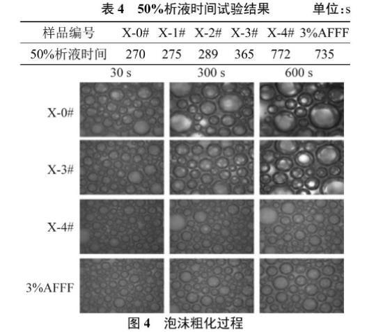 泡沫的稳定性主要由泡沫的排水、粗化和聚并等多因素决定[10]。双注射器技术产生的6种泡沫的图像见图3,而6种泡沫的50%析液时间测定结果见表4。这6种泡沫在0 s时有相同的初始体积,在重力作用下发生泡沫排水现象,600 s后6种泡沫的排水体积之间存在很大的差异,X-0#、X-1#和X-2#样品泡沫排水量几乎达到发泡前泡沫溶液的初始体积,X-3#泡沫排水量明显降低,X-4#泡沫的排水体积较3%AFFF的排水体积少。以上结果表明添加质量分数0.30%的XG能很好地减缓泡沫排水,使无氟泡沫和商用泡沫灭火剂有相当的泡沫稳定性。