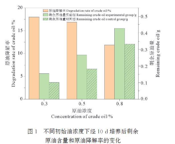 图1不同初始油浓度下经10d培养后剩余原油含量和原油降解率的变化