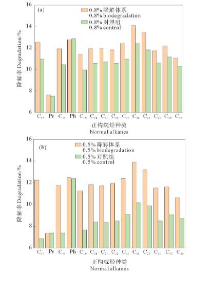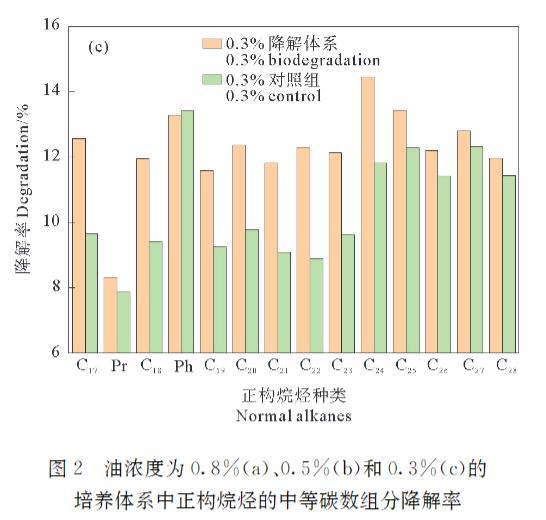 图2油浓度为0.8%(a)、0.5%(b)和0.3%(c)的培养体系中正构烷烃的中等碳数组分降解率