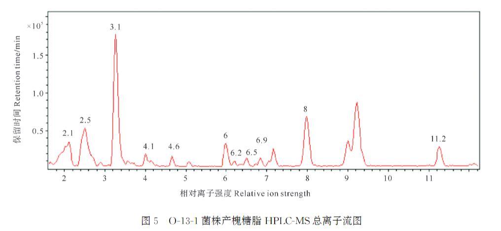 图5 O-13-1菌株产槐糖脂HPLC-MS总离子流图
