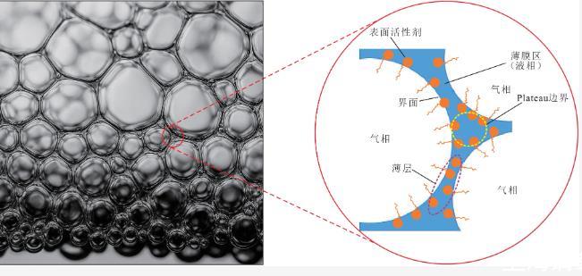 泡沫是一种热力学不稳定的胶体体系,其中气体分散在表面活性剂稳定的连续液相中,可以自发破裂。图1显示由表面活性剂形成的典型泡沫结构。提高CO2泡沫的稳定性具有挑战性,因为在高压储层条件下,CO2更易溶于水,溶解的CO2会引起泡沫的团聚。