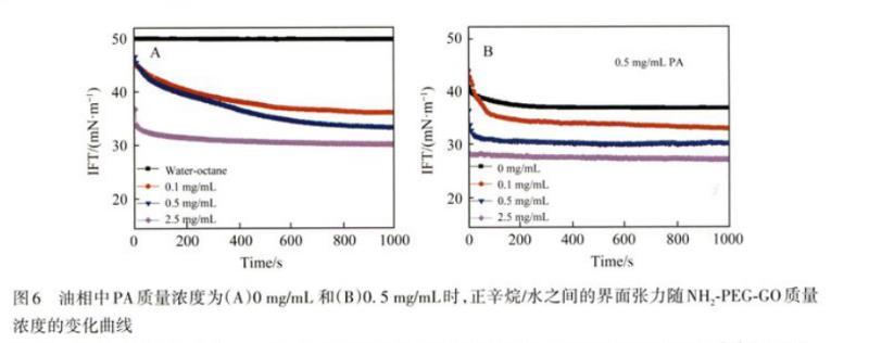 图6油相中PA质量浓度为(A)0 mg/mL和(B)0.5 mg/mL时,正辛烷/水之间的界面张力随NH2-PEG-GO质量浓度的变化曲线