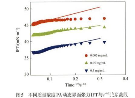 图5不同质量浓度PA动态界面张力IFT与t-1/2关系曲线