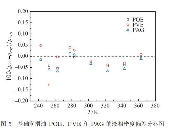 图 5 基础润滑油 POE、PVE 和 PAG 的液相密度偏差分布图