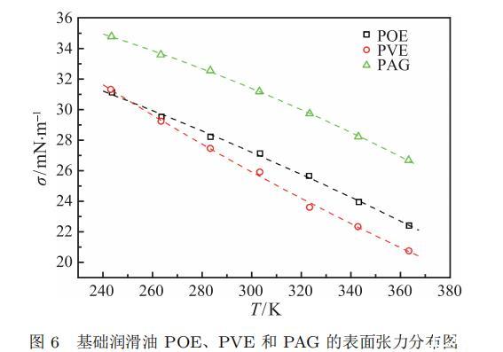 图 6 基础润滑油 POE、PVE 和 PAG 的表面张力分布图