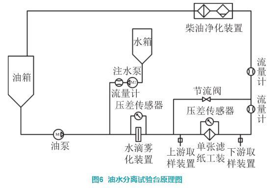 油水分离试验台的原理如图6所示。通过向水滴雾化装置上游管路内按质量比0.15%的比例注水,油水混合物通过孔板装置后柴油中的水会破散成更小的水滴,通过控制水滴雾化装置两端的压差可以得到不同粒径分布的水滴,调节压差得到合适粒径分布的水滴进行油水分离效率试验。