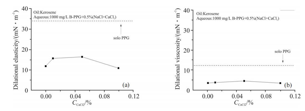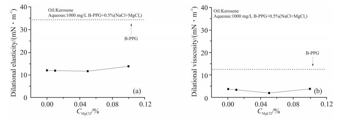 Ca2+浓度对1000mg/LB-PPG溶液界面扩张参数的影响见Fig.7。从图中可以看出,电解质中Ca2+含量增大对界面扩张黏性的影响较小;而扩张弹性则在低Ca2+浓度条件下略有变化,从12mN/m增大到17mN/m。二价阳离子能够与2个负电荷发生静电吸引作用,因此,可作为“桥梁”,与不同B-PPG分子中的负电荷发生作用,增加聚集体结构的强度。Ca2+比Mg2+半径大,与不同B-PPG分子发生作用的几率也大,增大扩张弹性的幅度较大。