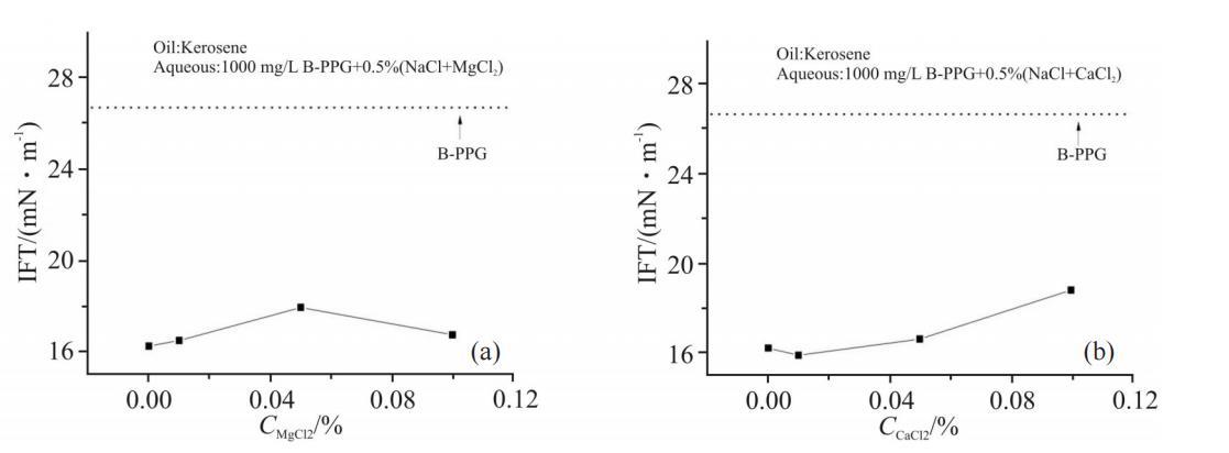 油藏地层水中含有Ca2+,Mg2+等二价阳离子,作为反离子可与B-PPG吸附膜发生作用,可能有其独特的行为。固定水相总矿化度为0.5%,改变其中二价阳离子的含量,考察了Ca2+和Mg2+对B-PPG界面膜性质的影响。Fig.5所示为二价阳离子浓度对1000mg/LB-PPG溶液界面张力的影响。从图中可以看出,随着电解质中二价阳离子浓度增大,界面张力均略有升高,其中Ca2+的影响程度略高于Mg2+。从阳离子半径考虑,Ca2+>Mg2+>Na+,因此,用二价阳离子部分顶替一价阳离子,可能造成界面分子排列的紧密程度有所降低,界面张力略有升高。Ca2+的半径更大,界面张力的升高趋势更明显。