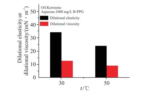 温度对1000 mg/L B-PPG溶液界面扩张弹性和黏性的影响见Fig.9。实验结果表明,当温度从30℃升高到50℃时,界面扩张弹性和黏性均明显降低。随着温度升高,界面膜变得疏松,同时,B-PPG分子的热运动加剧,扩散交换过程变快,上述变化均会造成界面膜强度的降低,50℃时B-PPG界面膜的弹性和黏性不到30℃的1/2。