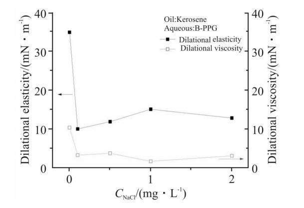 Fig.4为NaCl浓度对1000mg/L的B-PPG溶液界面扩张参数的影响。由图可知,加入NaCl后,体系的界面扩张弹性和扩张黏性都明显下降,扩张弹性降低超过了20mN/m,扩张黏性也由10mN/m左右下降到了5mN/m左右。