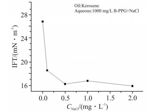 矿化度是影响化学驱配方效果的关键因素之一。B-PPG分子中的酰胺基团在水中可部分水解产生负电荷,因此,其界面性能也会受到矿化度的影响。1000mg/L既是B-PPG的CAC,也是现场配方的使用浓度,因此,在此浓度下考察了矿化度对B-PPG界面膜性质的影响。不同浓度的NaCl对1000 mg/L B-PPG界面张力的影响见Fig.3。可以看出,NaCl的加入可以明显降低B-PPG体系的界面张力。随着NaCl浓度的增加,界面张力下降程度放缓;当NaCl浓度高于0.5%时,界面张力不再变化。这是电解质压缩B-PPG界面膜的双电层,减弱了静电斥力,从而增大了B-PPG的吸附量造成的。