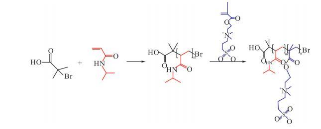 首先将a-溴代异丁酸(0.0167g,相当于0.1mmol)、NIPAM单体和5mL去离子水加入至真空反应管I中。随后,利用超声处理直至所有固体组分完全溶解,充入氮气作为保护气持续10min。另外,在真空反应管II中添加CuBr(0.0036g,0.025mmol)和2mL去离子水,进一步加入Me。TREN配体(13.4μL,0.05 mmol)和PMDETA配体(8.9μL,0.05mmol),充入氮气保护10min。在保持氮气氛围的条件下,使用真空注射器将真空反应管I中的内容物转移到真空反应管II中并进行密封,反应30min。此外,在真空反应管III中将甜菜碱单体和5mL去离子水混合,经过超声处理直到完全溶解,充入氮气保护10min。NIPAM聚合反应启动1h后,再将真空反应管III中的物质通过真空注射器,在氮气保护下加入到反应管II中,继续反应2h以确保反应彻底完成。反应完成后,将反应液置入截留分子量为3500的透析袋中,用去离子水透析48h,每8h更换一次水。最终,将透析后的溶液进行冷冻干燥处理,去除所有水分,从而得到最终产物。在整个合成过程中,控制加入的单体总的物质的量为10mmol,根据NIPAM的加入比例(分别为100%,80%,50%,40%,20%和0%)合成了一系列P(NIPAM-b-DMMPPS)嵌段聚合物。这些聚合物根据其NIPAM的比例命名为PN_100,PN_80,PN_50,PN_40,PN_20和PN_0,以便于后续的实验分析与研究。精确控制实验条件和原料比例。聚合过程如Scheme1所示。