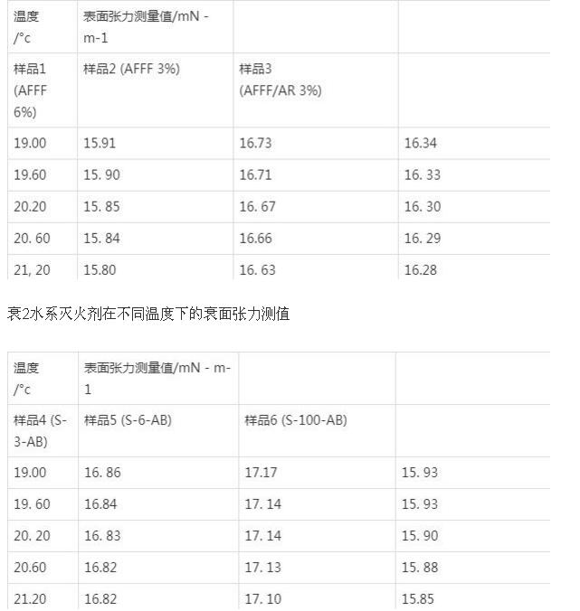 温度条件对于液体表面张力存在着很大的影响。大 量试验数据表明,液体的表面张力会随着温度的升高而 降低。通过对一系列流体灭火剂产品,包括不同配比的 泡沫灭火剂(成膜型)、水系灭火剂等样品进行测试,可以 清晰地从表1、表2中看出,温度的变化对流体型灭火剤 的表面张力存在一定程度的影响。