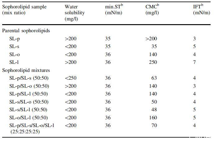 4个亲代SLs中的每一个都产生了35–36 mN/m的可比最小ST,但CMC值明显不同(表3)。 SL-p和SL-l的CMC值均大于200 mg/l,而SL-s和SL-o的CMC值分别为35 mg/l和140 mg/l。 IFT值范围为3 mN/m(SL-p)至7 mN/m(SL-l)。 为了控制SLs的表面活性,以50:50的混合比制备混合物,并重新评估其性能。 各混合物的内酯分布见表2。 经分析,最小ST和IFT相对不变,但CMC值确实因SL混合物而异。 通过混合获得了介于48 mg/l和140 mg/l之间的临界胶束浓度。 有趣的是,CMC值最低的SL混合物都含有SL-s成分。 特别是SL-s的CMC值为35 mg/l; 即使是以25:25:25:25的比例包含所有4种亲本SL的混合物,其CMC值(70 mg/l)也比不含SL-s成分的其他混合物低。 这些数据表明,SL-s对水的表面活性性能的影响更为显着。 通过使用较少的SL-s,可以实现相等的最小ST和IFT。 性能控制和高产量将通过降低成本最终有助于SLs的工业应用。 这些数据还指出,通过将不同的SLs混合在一起以获得所需的性质,可以在一定程度上控制SLs的表面活性性质。 虽然未达到表明这些SLs单独具有优越表面活性剂性能的最低标准,但其性能可能足以允许其作为石化表面活性剂添加剂的使用量增加,以便在大量使用表面活性剂的应用中尽量减少不利的环境影响。 SL-p和SL-l的CMC值均大于200 mg/l,而SL-s和SL-o的CMC值分别为35 mg/l和140 mg/l。IFT值范围为3 mN/m(SL-p)至7 mN/m(SL-l)。为了控制SLs的表面活性,以50:50的混合比制备混合物,并重新评估其性能。各混合物的内酯分布见表2。经分析,最小ST和IFT相对不变,但CMC值确实因SL混合物而异。通过混合获得了介于48 mg/l和140 mg/l之间的临界胶束浓度。有趣的是,CMC值最低的SL混合物都含有SL-s成分。特别是SL-s的CMC值为35 mg/l;通过将SL-s与SL-p、SL-o和SL-l以50:50的比例混合,CMC值分别增加到63 mg/l、50 mg/l和48 mg/l。即使是以25:25:25:25的比例包含所有4种亲本SL的混合物,其CMC值(70 mg/l)也比不含SL-s成分的其他混合物低。这些数据表明,SL-s对水的表面活性性能的影响更为显著。通过使用较少的SL-s,可以实现相等的最小ST和IFT。性能控制和高产量将通过降低成本最终有助于SLs的工业应用。这些数据还指出,通过将不同的SLs混合在一起以获得所需的性质,可以在一定程度上控制SLs的表面活性性质。虽然未达到表明这些SLs单独具有优越表面活性剂性能的最低标准,但其性能可能足以允许其作为石化表面活性剂添加剂的使用量增加,以便在大量使用表面活性剂的应用中尽量减少不利的环境影响。