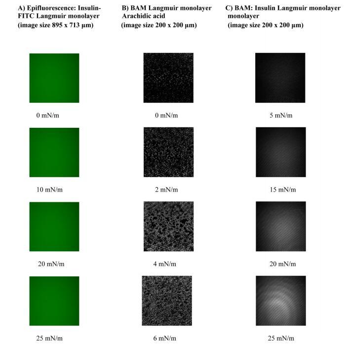3.4. 人胰岛素朗缪尔单层的表观荧光和布鲁斯特角显微镜观察。 人胰岛素Langmuir单层的形貌通过FITC人胰岛素的表观荧光进行检查,而布鲁斯特角显微镜用于2-D纯人胰岛素。由于胰岛素是非荧光的,因此必须附加荧光团才能使用表观荧光显微镜。 蛋白质常用的探针是异硫氰酸荧光素(FITC)。