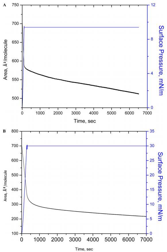 图3.在亚相pH值5.6下,在表面压力为10(A)和30 mN/m(B)的条件下,对人胰岛素Langmuir单层膜进行90 min的稳定性测量。