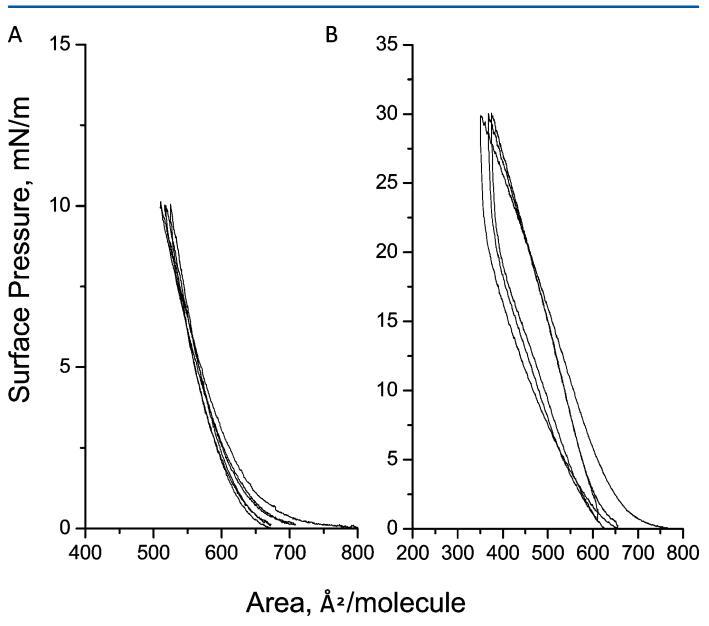 图2.三个压缩 − 在亚相pH值5.6下,减压循环达到10(a)和30 mN/m(B)的人胰岛素Langmuir单层表面压力。