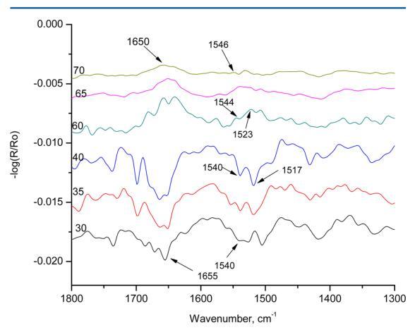 图8显示了HI-Langmuir单层在10 mN m处的p极化 − 1在30、35、40、60、65和70°的六个不同角度。 在布儒斯特角之前,30、35和40 mN/m处的角未显示出β片的特征带。 所有三个角度显示1655和1540厘米处的条纹 − 1分别对应于酰胺I和酰胺II吸收。 这条带子在1517厘米处 − 1,对应于α-螺旋,在35°和40°中存在。 在布儒斯特角之后,所有60、65和70°的三个角都显示出介于1650和1655之间的带,这对应于α-螺旋中的酰胺I吸收。 当角度为60°时,在1523 cm处可以看到峰值 − 1,对应于β片。 光谱中的其他谱带都不是α-螺旋或β-片的特征。 光谱表明HI在空气中以α-螺旋的形式存在 − 水界面。 在10 mN m的恒定压力下,随着角度的增加 − 1,发现光谱中的α-螺旋特征减少。