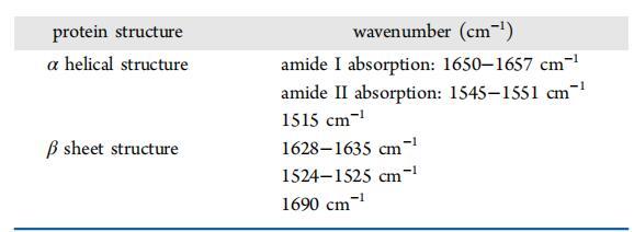 表2。 α螺旋和β片的主带位置特征及酰胺Ⅰ和酰胺Ⅱ的红外振动