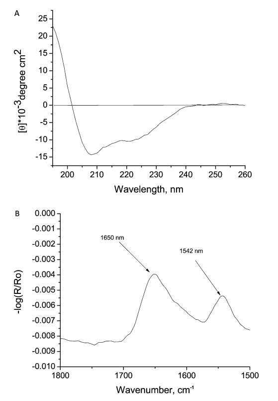 图6。 (A) 在pH 2和温度20±1°C条件下,水性胰岛素的圆二色光谱和(B)FTIR光谱。胰岛素浓度分别为0.3和2 mg-mL − 分别为1。