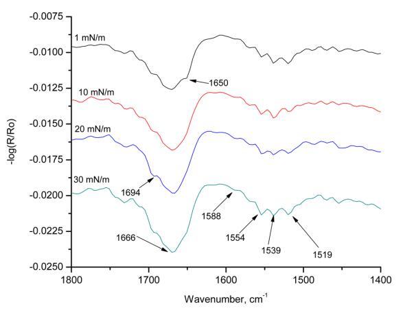 图9显示了在不同表面压力下获得的HI-Langmuir单层膜的s偏振辐照度。 在1 mN m的表面压力下 − 1,在1650 cm处存在一条带 − 1对应于α-螺旋。 随着表面压力的增加,该条带消失,并在1666 cm处并入该条带 − 1. 这条带子长1666厘米 − 1包括β-转角和α-螺旋。 这条带子有1694厘米长 − 1对应于β片。 这条带子在1519厘米处 − 1也对应于α-螺旋。 在入射角为60°的情况下,在1670处观察到的能带可归属于存在于β-转角中的空间约束C=O部分,或者由于β-薄片中的跃迁偶极耦合而注意到峰值中的分裂。 当改变表面压力时,最强烈的谱带出现在1554和1539厘米处 − 1,两条带均对应于酰胺II区的α-螺旋。 所有三条主谱带都表明HI-Langmuir单层的s极化辐照度中存在α-螺旋。
