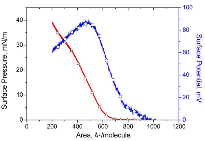 图1。 表面压力( △) 表面电位 − 区域( ○) 亚相pH值5.6时人胰岛素Langmuir单层的等温线。