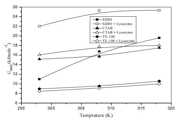 图1。不同表面活性剂在溶菌酶存在和不存在时Gmin随温度的变化
