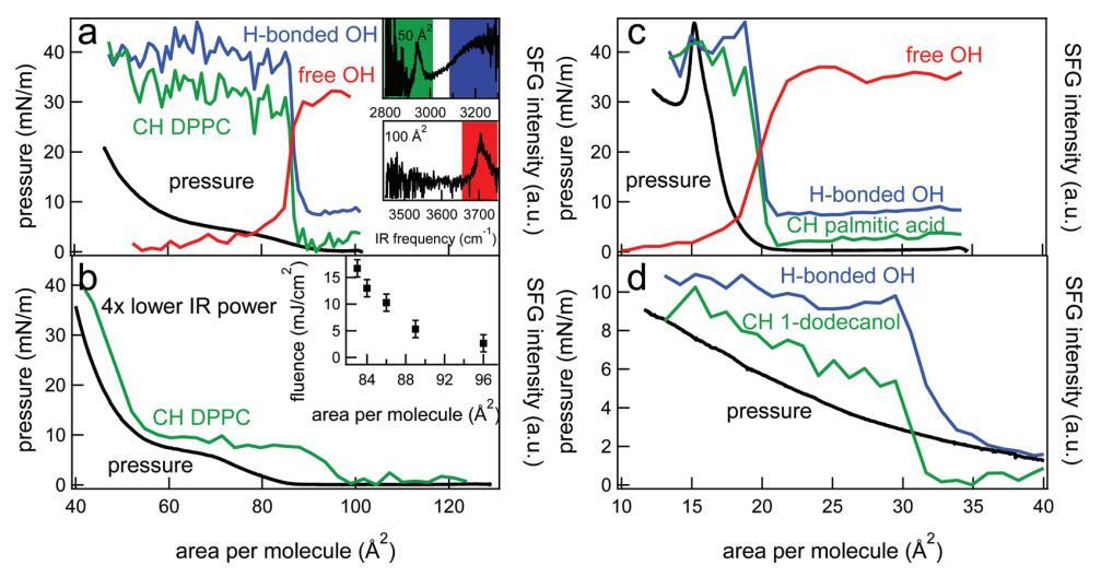 图2。(a)DPPC的CH信号(绿色)、氢键OH信号(蓝色)和自由OH信号(红色)的表面压力(黑色,左轴)和积分SFG强度(右轴),作为连续压缩单层过程中每个分子面积的函数。为了清晰起见,集成SFG信号被归一化,并且彼此之间具有小偏移。集成光谱区域由插图中的彩色正方形标记,分别显示CH/OH键合和游离OH区域中每个分子50和100Å2的SFG光谱。相对较高的红外通量(∼已使用10 mJ/cm2)。(b)与(a)类似,但红外功率降低了四倍,导致通量降低了四倍(∼2.5 mJ/cm2)。插图显示了改变红外注量对SFG信号出现的每个分子面积的影响。(c)类似于(a),但适用于棕榈酸。(d)类似于(a),但对于1-十二醇。在这种情况下,未测量1-十二醇的游离OH。SFG结果是在SSP极化下获得的。