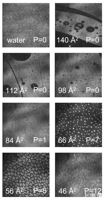 图3。水上不同密度DPPC的布儒斯特角显微镜图像。图像大小为600×600μm。白色区域表示高密度,而黑色区域表示低密度。在每个面板中,每个分子的面积(单位为Å2)在左下角报告,表面压力(单位为mN/m)在右下角报告。这些照片是用自动调整灵敏度的相机拍摄的,这样就无法比较图像之间的灰度等级。