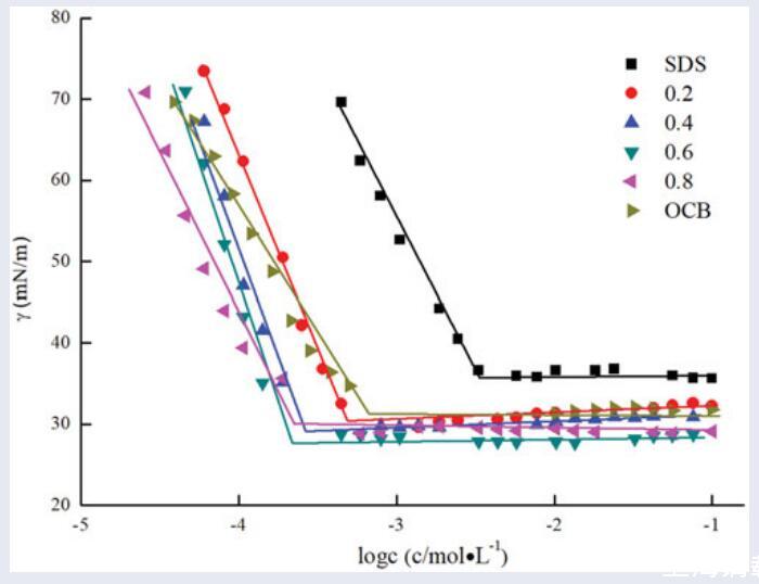 用表面张力法研究了橄榄油两性表面活性剂(羧基甜菜碱OCB和磺基甜菜碱OSB)与阴离子表面活性剂十二烷基苯磺酸钠(SDBS)在不同摩尔分数下的表面性质。研究了无机盐(NaCl、MgCl2)的加入对OCB/SDBS和OSB/SDBS体系表面活性的影响。结果表明,这两种混合体系在所研究的所有摩尔分数上都比它们各自的组分具有更低的CMC值和更高的表面活性。同时,根据正规溶液理论,通过胶束相互作用参数(βm)确定了OCB/SDBS和OSB/SDBS之间明显的协同作用。观察到,αOCB=0.6时的OCB/SDBS混合体系和αOSB=0.6时的OSB/SDBS混合体系表现出最强的协同作用。此外,添加无机盐后,二元表面活性剂混合物表现出更好的表面活性,并且无机盐金属离子的不同价态对混合体系的表面能力影响不同:Mg2+>Na+。