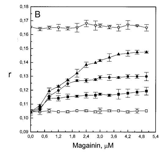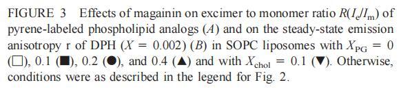 有趣的是,在存在酸性磷脂的情况下,肌动蛋白/脂质的摩尔比(在该摩尔比下,肌动蛋白的初始增量趋于稳定)分别为1:21、1:16和1:12.5,对应于XPG=0.1、0.2和0.4(图2A),分别产生1:2、1:3和1:5的肌动蛋白/磷脂化学计量比。同时,DPH的初始r增量在magainin/脂质摩尔比为~1:30、1:12和1:5时趋于平稳(XPG分别为0.1、0.2和0.4),对应于大约1:3、1:2.5和1:2的magainin/PG化学计量比(图3)。据报道,在这些肽/脂质摩尔比下,magainin可插入含酸性磷脂的膜中(Ludtke等人,1994年)。此外,已经证明,双分子层中magainin的=-螺旋的方向取决于肽与脂质的摩尔比,在上述化学计量比下,螺旋应垂直于膜表面插入,在含PG的膜中形成孔(Ludtke等人,1996)。这些孔不仅由两亲螺旋的极性面组成,而且还由脂质的极性头基组成,内外单层通过这些孔衬脂质是连续的。膜中的这种结构可能会降低探针芘部分微环境的极性,从而提高其量子产率。有趣的是,当XPG>0.1时,magainin 2逐渐降低Ie/Im值(图3 A),这与增强的酰基链顺序减少脂质侧向扩散的速率一致。然而,由于magainin 2已经在XPG=0.1时增加了r,Ie/Im没有变化,蜜桃性爱视频网站可以得出结论,PPDPG探针向微区富集以及其横向扩散的减少正在发生。