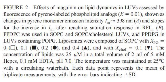 除上述相似性外,当使用芘标记的脂质类似物研究酸性磷脂对脂质动力学的影响时,两种肽之间也存在明显差异。Magainin 2导致两性磷脂组成的LUV的芘发射显着猝灭(图2A)。然而,在PG存在的情况下,芘的单体强度增加,XPG逐渐增加了这种效应的幅度(图2A)。圆二色性、拉曼光谱、傅里叶变换红外光谱和固态核磁共振研究表明,马盖宁在与脂质双层结合时采用螺旋构象(Matsuzaki等人,1989年、1991年;Williams等人,1990年;Jackson等人,1992年;Bechinger等人,1993年;Wieprecht等人,1997年;Hirsh等人,1996年)。magainin 2对两种膜的这些不同影响可能是由于1)通过与肽的带正电基团(例如赖氨酸的?氨基)直接接触使芘荧光猝灭,或2)插入双层的=-螺旋肽改变荧光团的微环境,与层平面平行,如上所述。然而,在PG存在的情况下,肽的正电荷应在与酸性磷脂形成静电复合物时被中和,从而减少由于π-阳离子相互作用导致的芘荧光猝灭。