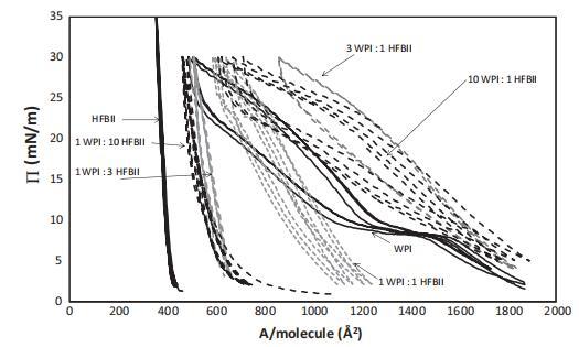 值得注意的是,对于纯HFBII,П–A等温线在连续的压缩膨胀循环中不会发生变化,这再次表明HFBII不可撤销地附着在界面上,几乎没有任何构象变化。对于纯WPI和1:1混合物,П–A等温线略微向较小区域移动,这表明由于WPI分子的构象变化、多层形成或如前所述,由于WPI的解吸,表面重排的可能性较小。