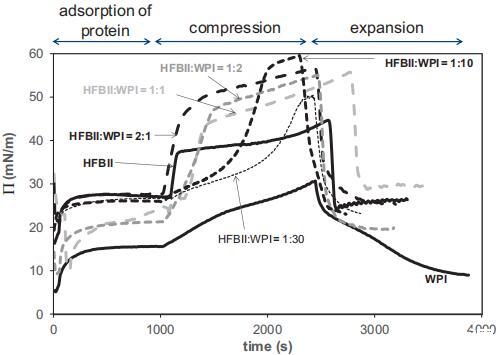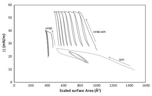 图4。˘/A-纯HFBII、纯WPI及其1:10混合物的吸附系统的等温线,所有这些系统的总蛋白质浓度均为0.1 mg/ml。等温线包括第一个压缩/膨胀循环和5个滞后环。将HFBII和WPI的表面积缩放至摊铺系统曲线中弯曲点的出现,对应于表面的明显紧密堆积过渡(图1)。