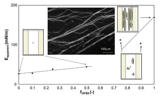 图2。表观模量作为扩散层HFBII分数的函数,以及槽屏障之间界面上褶皱斑块的图示。右边是纯HFBII层的一个褶皱斑的显微镜照片。