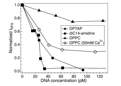 图7(上图)所示的压缩等温线清楚地表明,DNA对diC14氨基单层膜的影响,在很大的密度范围内,是增加表面压力,或等效地降低表面张力。也就是说,加入DNA后,表面生成的自由能总是变得更有利。然而,在没有进一步信息的情况下,这些实验几乎无法深入了解表面热力学变化的分子基础。双14-氨基单分子膜的CH区域的VSF光谱作为DNA浓度的函数,以及由此产生的CH3SS/CH2 SS比率,提供了这样的见解。如图7(下图)所示,向亚相添加DNA,即使在40 pM以下的体积浓度下,也会导致脂质尾部顺序的强烈增加。在解释电子自旋共振研究的结果时,贝纳蒂及其同事曾认为,吸附的DNA使凝胶相双氰胺双层(低于23°C)流态化,并使液相双层(高于23°C)僵化,从而有效地平滑了在没有DNA的情况下急剧的热相变。91蜜桃性爱视频网站的光学和压力等温线测量都是在略低于熔融温度的情况下进行的。蜜桃性爱视频网站的压缩等温线表明,DNA的作用是增加表面上单个链之间的相互作用(降低表面张力),而光学测量表明,链相互作用的增加导致脂质尾部更有序。有趣的是,这些结果与这样一种情况是一致的,即DNA的加入似乎会产生脂质,两者之间的相互作用比没有DNA时更强烈,尾巴比没有DNA时更有序,链的流动性增强。这种脂链流动性和脂链顺序的解耦类似于之前观察到的胆固醇和DPPC混合物随温度变化的情况。92
