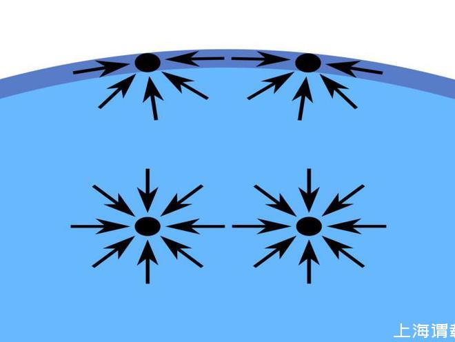 液体内部分子A与周围分子的作用力是对称的,相互抵消,合力为零,因此A在液体内部移动时不需要做功。而对于表面分子B,与表面下的水分子相互的作用力强烈,与表面上的空气作用力则较弱。由于上下的作用力大小不一致,因此B处于一个不对称的力场中,形成了一股指向内部的合力,此力力图将其拉回液体的内部。