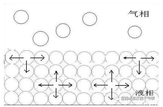 表面张力是因液体内部分子间的内聚力而产生的,表面分子由于受力不均衡而受到向内的作用力,与其它作用力形成平衡。原理示意如下: