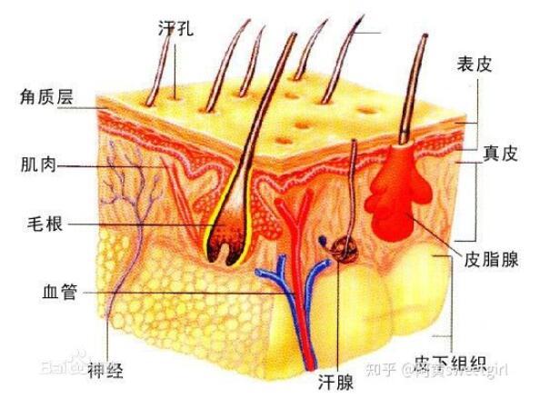 角质层:由数层角化细胞组成,含有角蛋白。它能抵抗摩擦,防止体液外渗和化学物质内侵。角蛋白吸水力较强,一般含水量不低于10%,以维持皮肤的柔润,如低于此值,皮肤则干燥,出现鳞屑或皲裂。由于部位不同,其厚度差异甚大,如眼睑、包皮、额部、腹部、肘窝等部位较薄,掌、跖部位最厚。