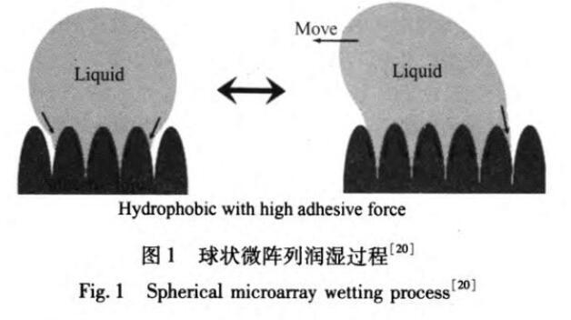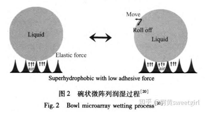 有评论说疏水高粘附的界面也会存在,然而这是具有特殊微纳米结构的表面,比如玫瑰花瓣等,这类的界面对微结构的几何性质要求较高。而通常的情形下,微纳米结构的存在会使疏水的界面出现超疏水的现象,其粘附力会更低,比如荷叶的表面。如下图中,上面的是疏水高粘附,下面是疏水低粘附的界面,然而这时由水与界面的接触面积决定的,接触面积越大,其粘附力越大,否则会越小。这是在化学性质相同时,从微结构的角度考虑的粘附力。这种疏水高粘附是与平整的高粘附界面相互比较来说的,然而其是否一定比亲水的物质粘附力大未曾可知。