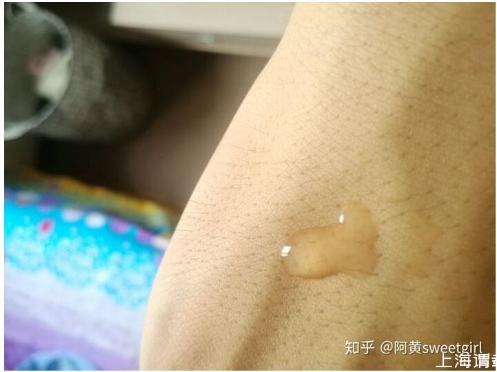 上图可以看出,半胱氨酸是亲水性的氨基酸,其形成的角蛋白是亲水的,所以皮肤的表层中的角蛋白是亲水的,所以皮肤表层是亲水的。由于对皮肤这块知识个人知识有限,且不管这种推测是否正确,直接用手做实验吧,请看下图水在皮肤表面的接触角。至少从结果上看,接触角是小于90度的,其是亲水的。