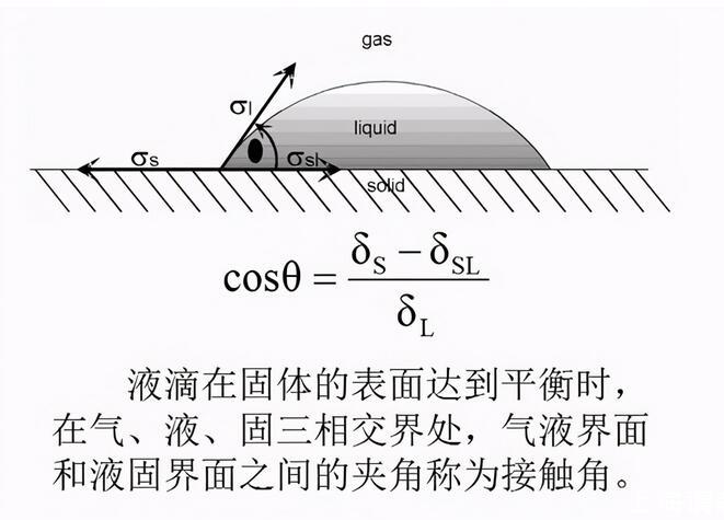 润湿:用一种流体取代固体表面另一种流体的过程。润湿角亦称接触角。